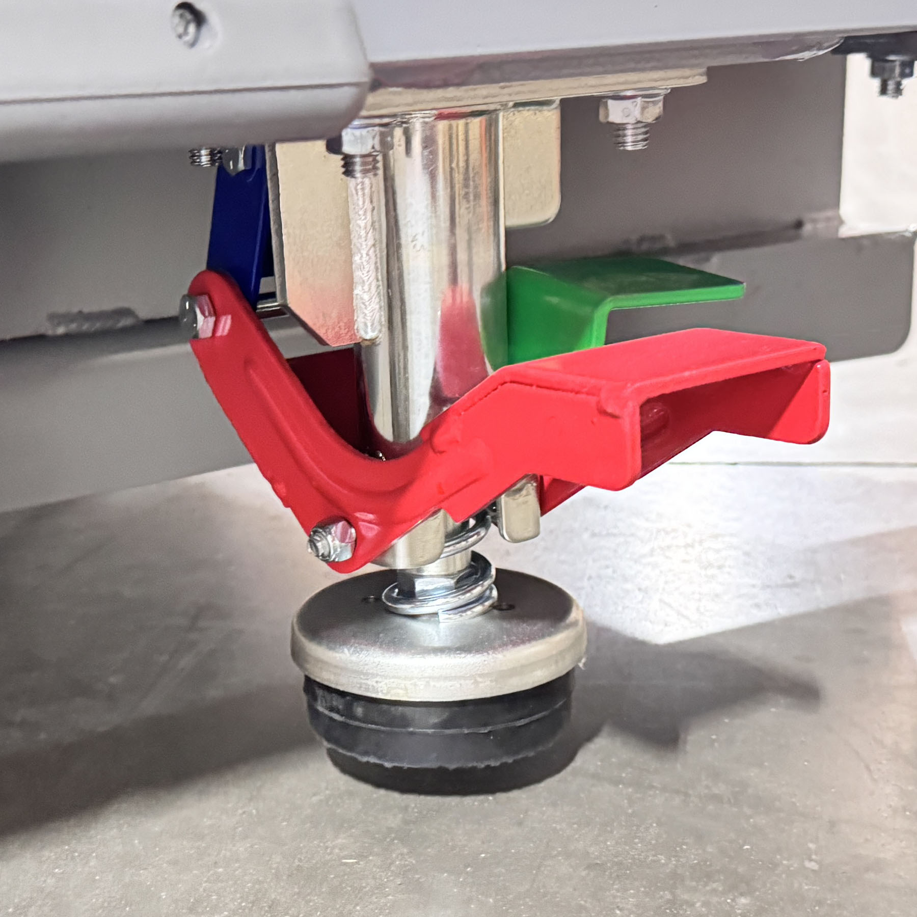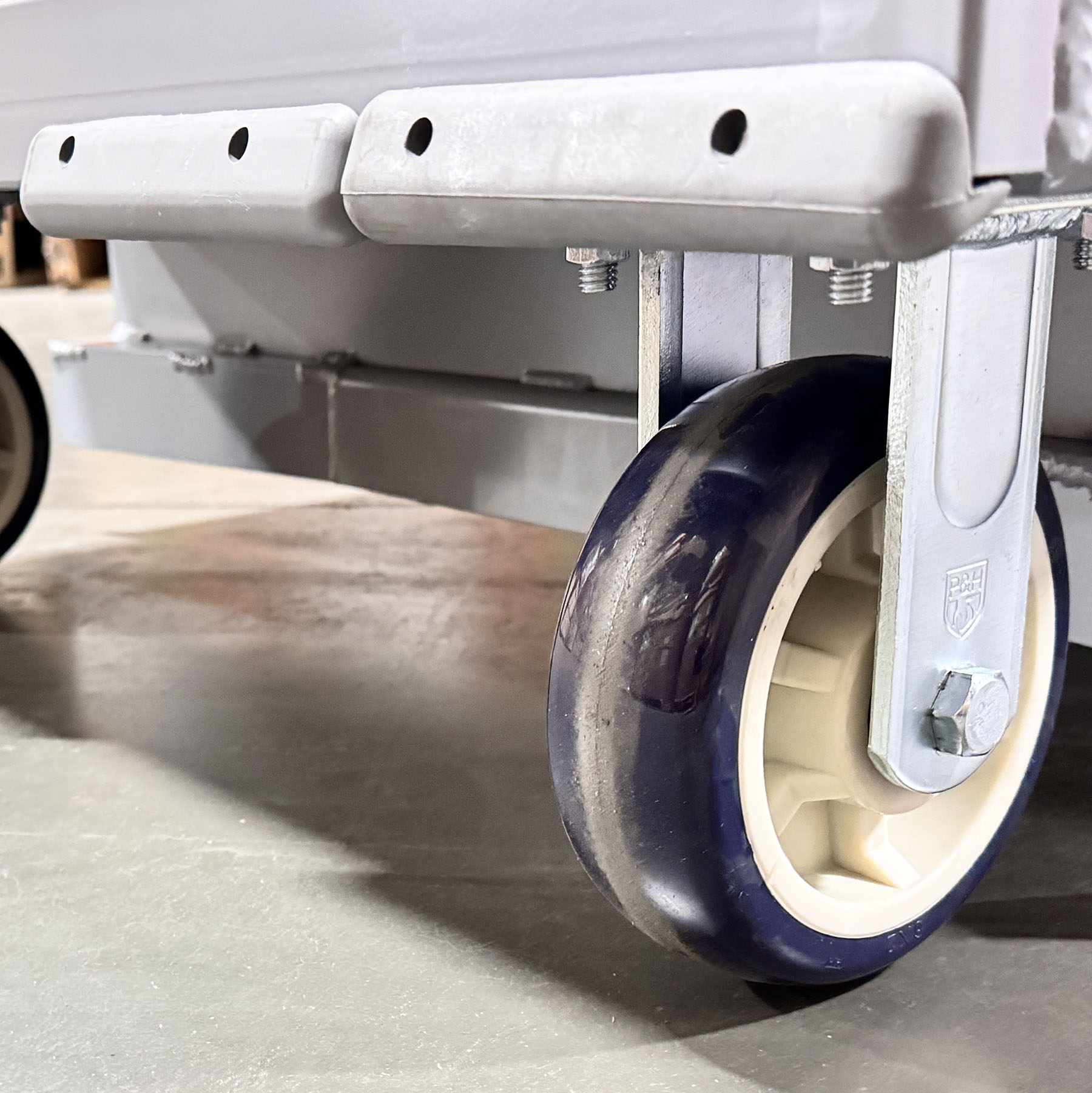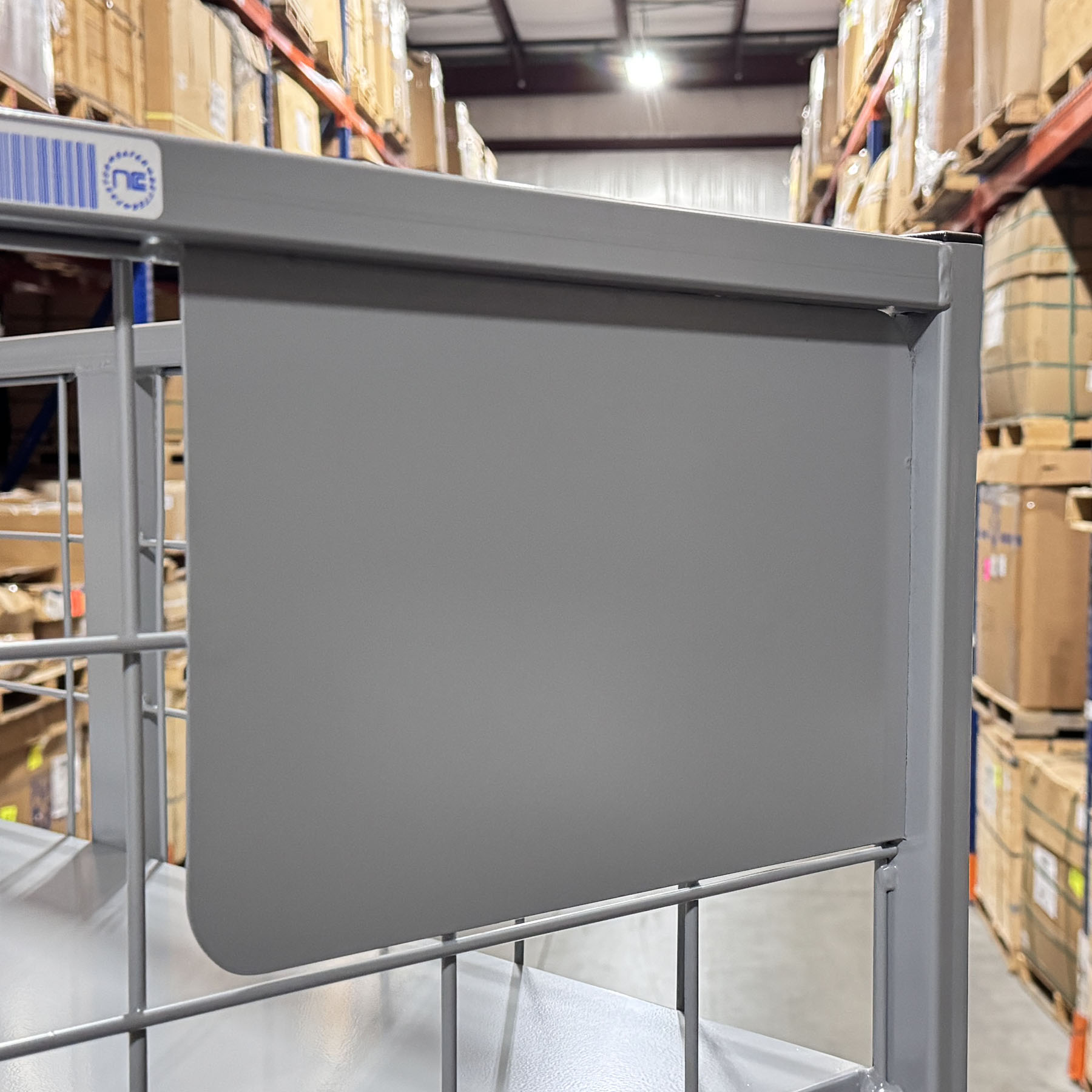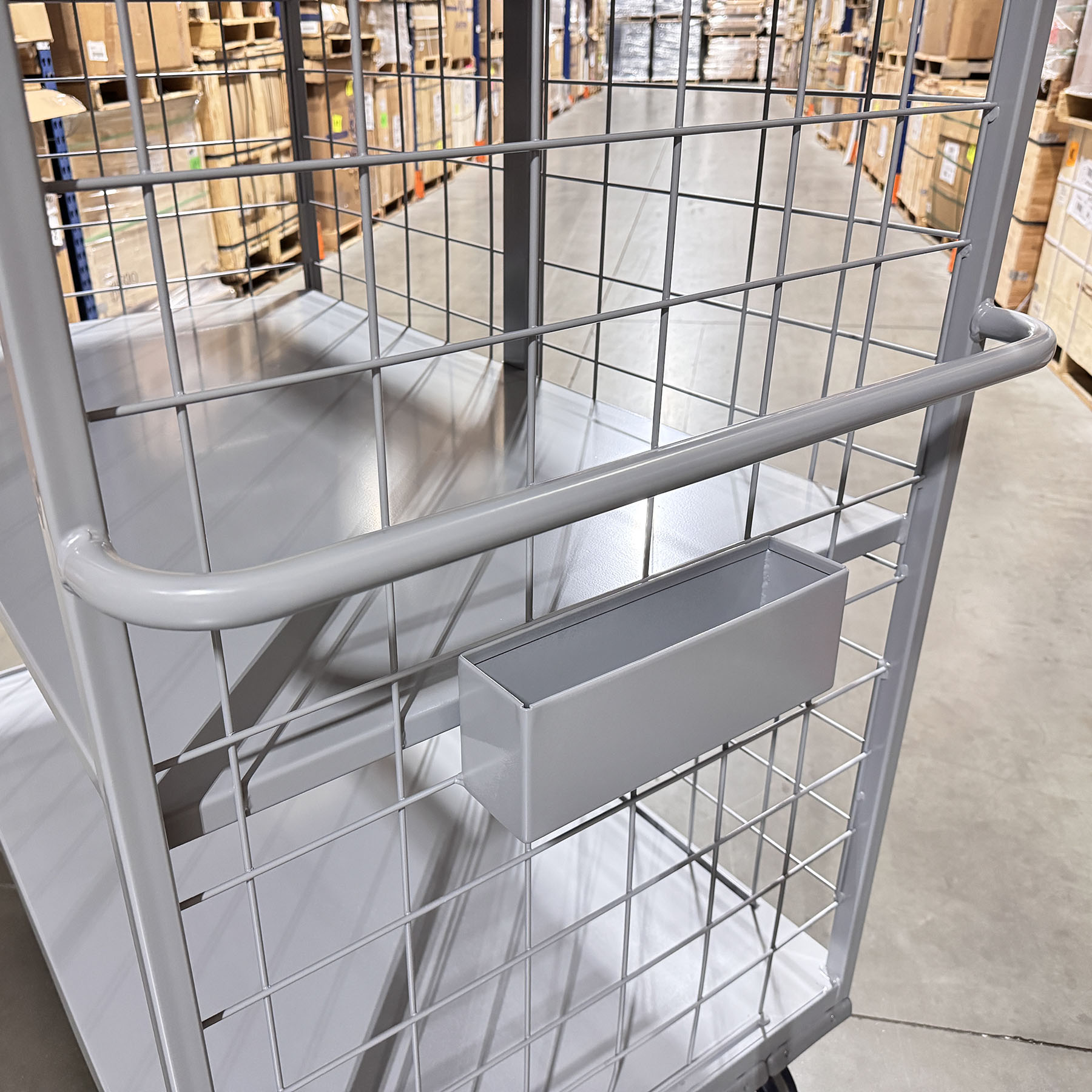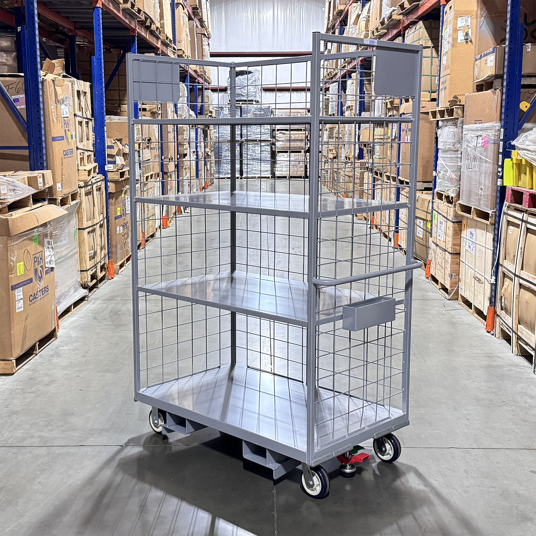 Heavy-duty 3-shelf distribution cart with forklift fork pockets, stomp brake, and accessory tray. Built for efficient warehouse transport and order picking.